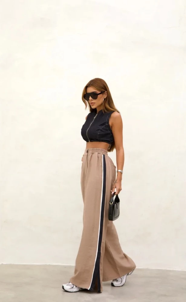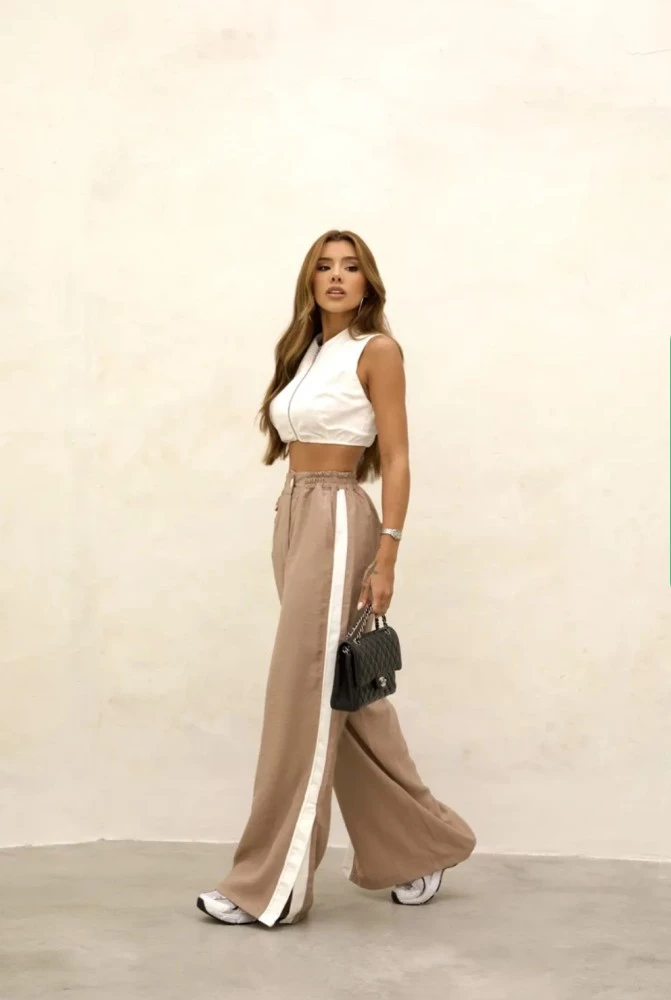 Conjunto confeccionado em um composê de alfaiataria e jeans, composto por cropped sem que possui gola redonda, reportes pés pintados nas laterais do busto, cavas regulares, elástico nas barras frontal e traseira, shape justo e fechamento frontal por zíper destacável. Calça wide-leg possui cintura alta, cos com laterais e costas com elástico, bolsos faça nas laterais da cintura, bolsos chapados na parte traseira, detalhe de recotes de jeans e vivo nas laterais, fendas nas laterais inferiores das pernas, shape solto, caimento reto e fechamento frontal por botão forrado e zíper. TAM único