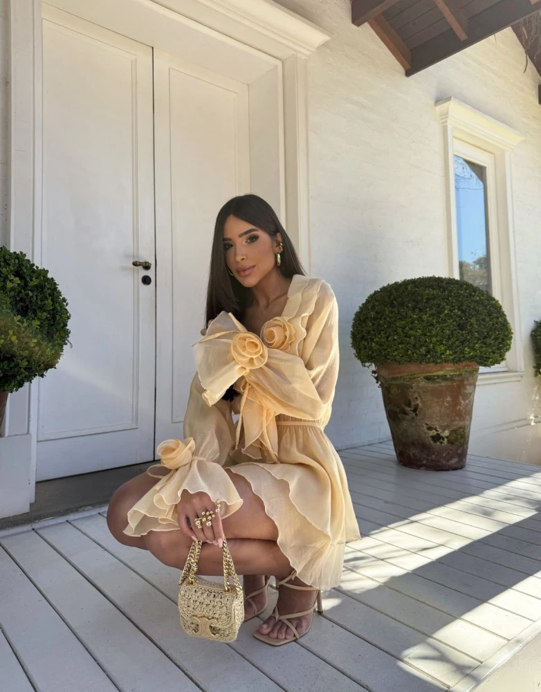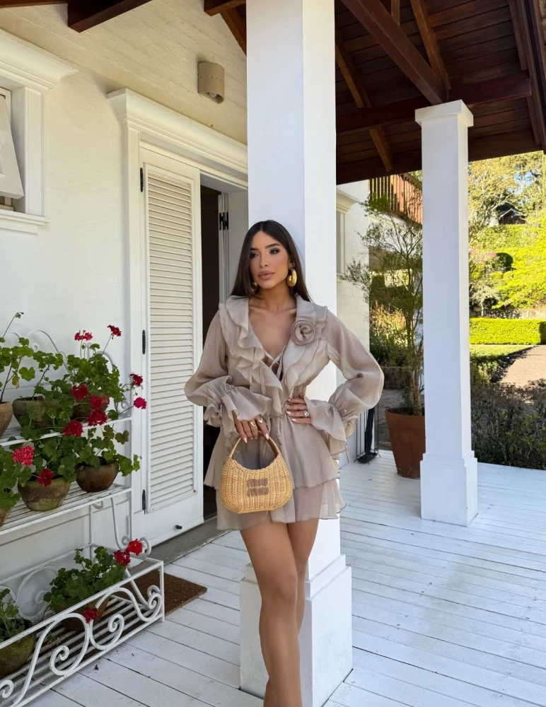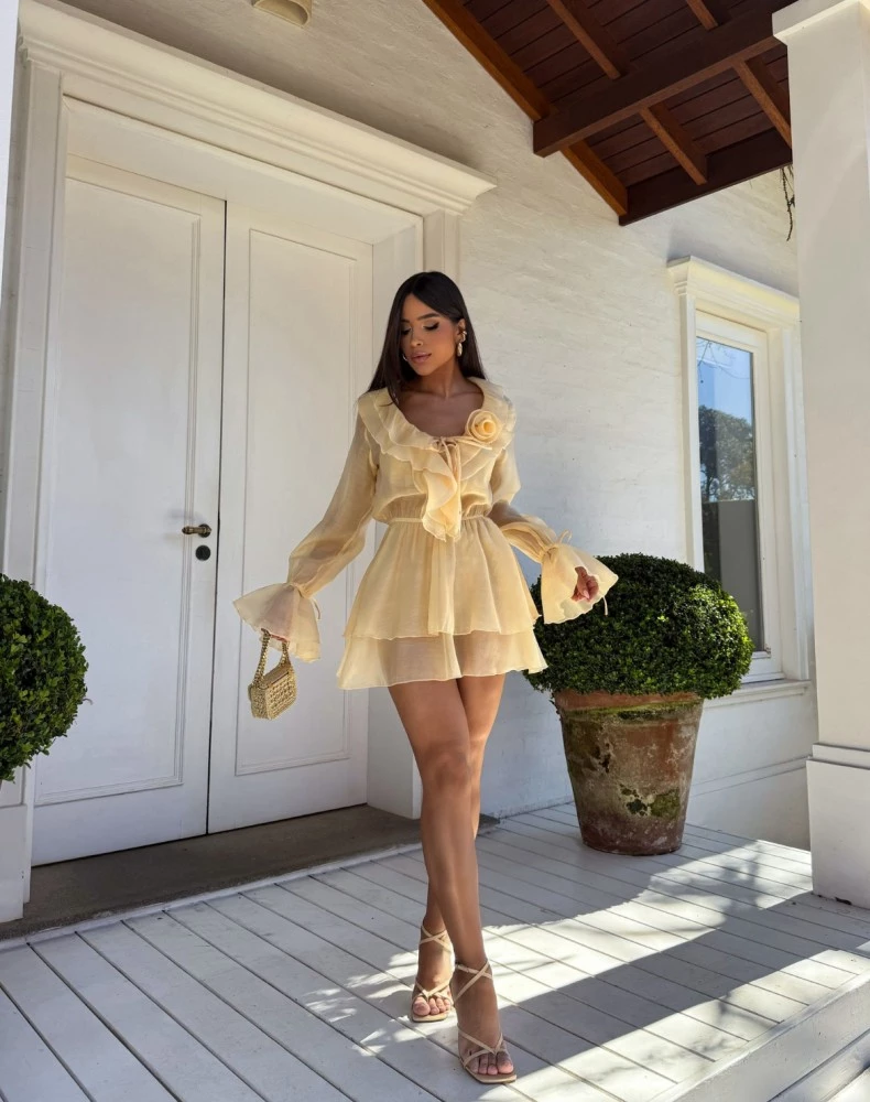 Vestido confeccionado em organza, possui mangas longas com punhos ajustados por elástico, detalhe de aplicação de flor nos punhos, decote V, babados sobrepostos contornando o decote e gola, amarração cruzada na parte frontal, aplicação de flor na lateral do decote, cintura ajustada por elástico, saia com babados sobrepostos, comprimento curto, shape solto e não possui fechamento.TAM único