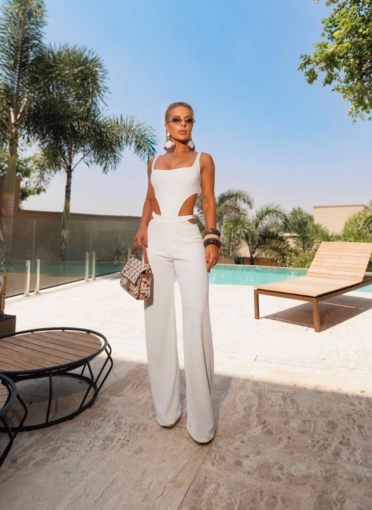 Malha Waflle texturizada com toque premium sendo seu conjunto: * Body cavado e estruturado. Esse body garante conforto e estilo pra dias praianos! * Calça pantalona com recorte equilibrado na medida certa na área da cintura com lindos detalhes em dourado.