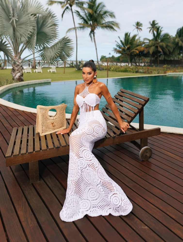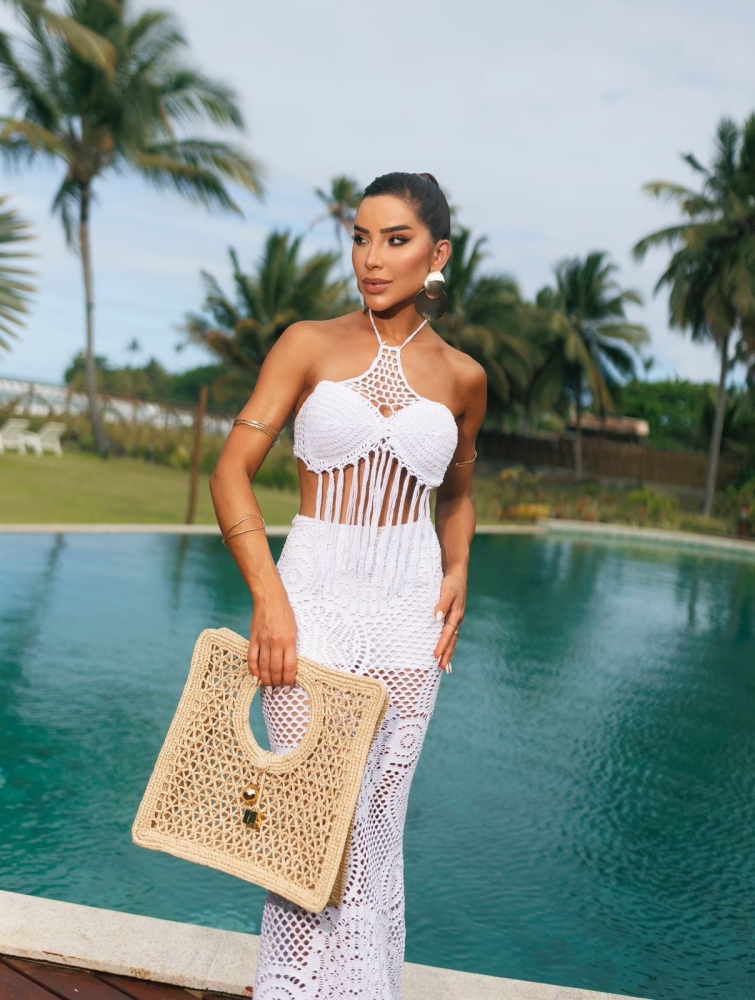 O grande sucesso da coleção: * Cropped em crochê 100% feito a mão com lindas franjas!! O diferencial dessa peça é tendo o peito sustentado por bojo (podendo ser removível) e totalmente forrado garantindo conforto e segurança. * Saia macramê natural com caimento sereia incrivelmente linda!!