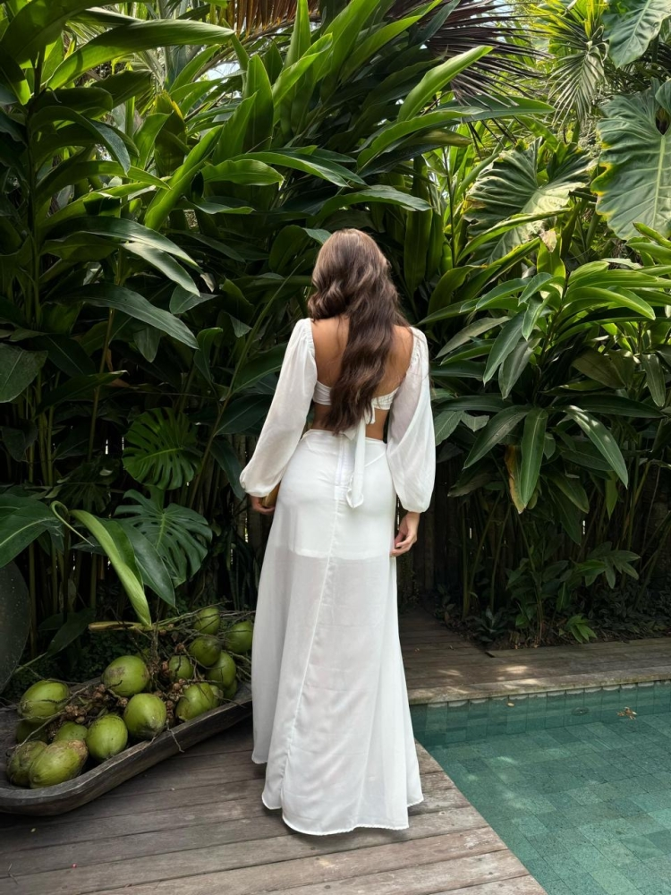 em Chifon O Conjunto Cancun traduz a leveza do estilo boho com seu cropped de mangas fluidas e saia longa que valoriza o movimento. Ideal para dias ensolarados, passeios ao ar livre ou festas ao pôr do sol, ele oferece conforto, frescor e um visual sofisticado com toque descontraído. Uma escolha perfeita para quem busca elegância natural e autenticidade.