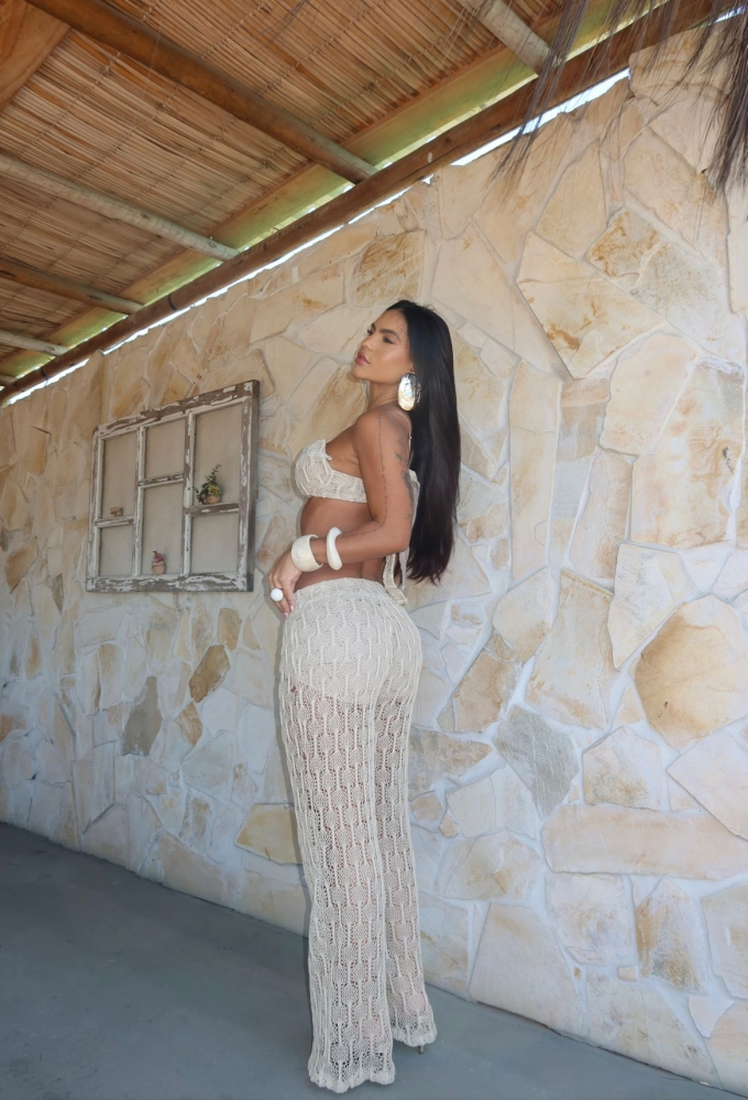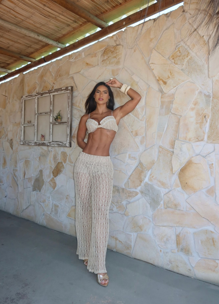 Conjunto confeccionado em tricot de malha, composto por top estilo biquíni, alças finas em elástico e regulagem, bojos, detalhe de aplicações no busto e fechamento posterior por amarração. Calça modelo pantalona possui cós com elástico embutido, comprimento longo e shape solto, o modelo acompanha short de forro solto da peça. TAM Único