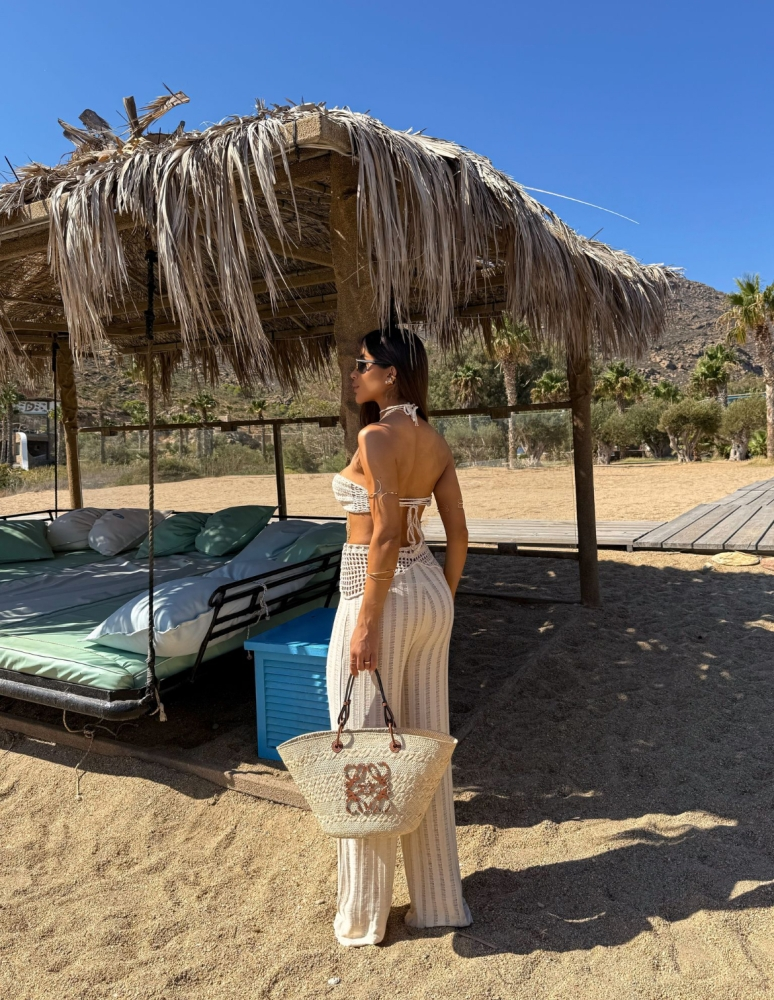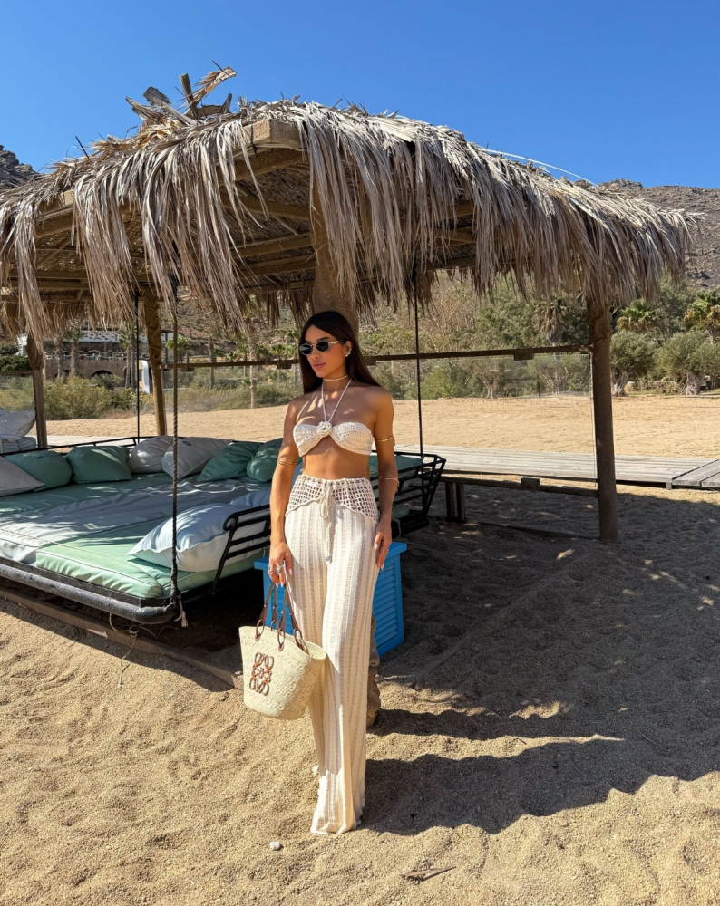 Conjunto confeccionado em um composê de crochê e tecido texturizado com média alta, composto por top em crochê, possui decote coração, detalhe em aplicação de flor no centro do decote que é presa por cordão removível que faz amarração na parte posterior do pescoço, não possui bojos, costas com pontos mais abertos e marração estilo corselet. Calça modelo pantalona corte reto, possui cintura alta, detalhe em crochê no cós com recorte assimétrico, cordão para regulagem na parte da cintura, comprimento longo e shape solto. TAM Único