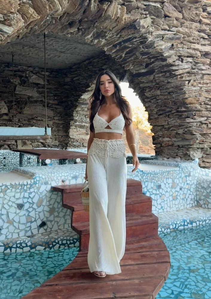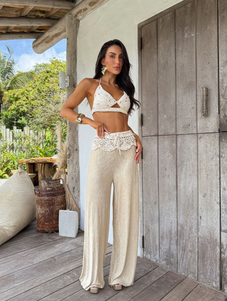 Conjunto confeccionado em um composê de crochê e malha texturizada, composto por cropped de alças finas que fazem amarração na parte posterior do pescoço e costas, decote coração e detalhe vazado na parte frontal. Calça pantalona possui cintura alta, cóls em crochê, cordão para regulagem e amarração, detalhe de acabamento do crochê em ondas na barra, calça fluida e shape solto. TAM único