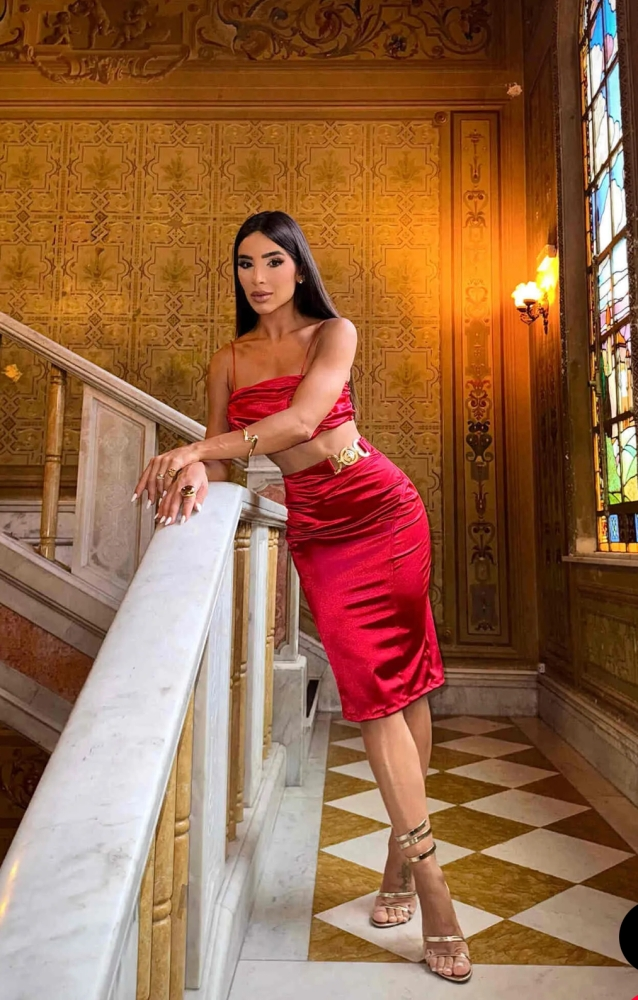 Conjunto confeccionado em tecido acetinado com alta elasticidade, composto por cropped com decote reto, alças finas em elástico redondo, laterais do busto drapeadas, elástico nas barras superior e inferior traseira e fechamento por zíper destacável. Saia midi possui cintura alta, cós com detalhe de aplicação de fivela de metal dourada na lateral esquerda, recortes pespontados na parte frontal, shape justo e fechamento por zíper lateral. TAM único